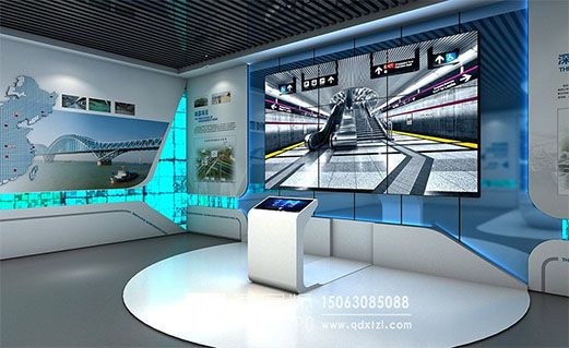 烟台展厅设计空间小狭窄幽长,可考虑环形墙面与顶部椭圆线条等元素,使其和谐融合,不至于突兀生硬,拐角的墙面放置了多媒体展示屏幕,这样展台视觉会更加的震撼,不仅填补了空间还提升了这个空间的功能。