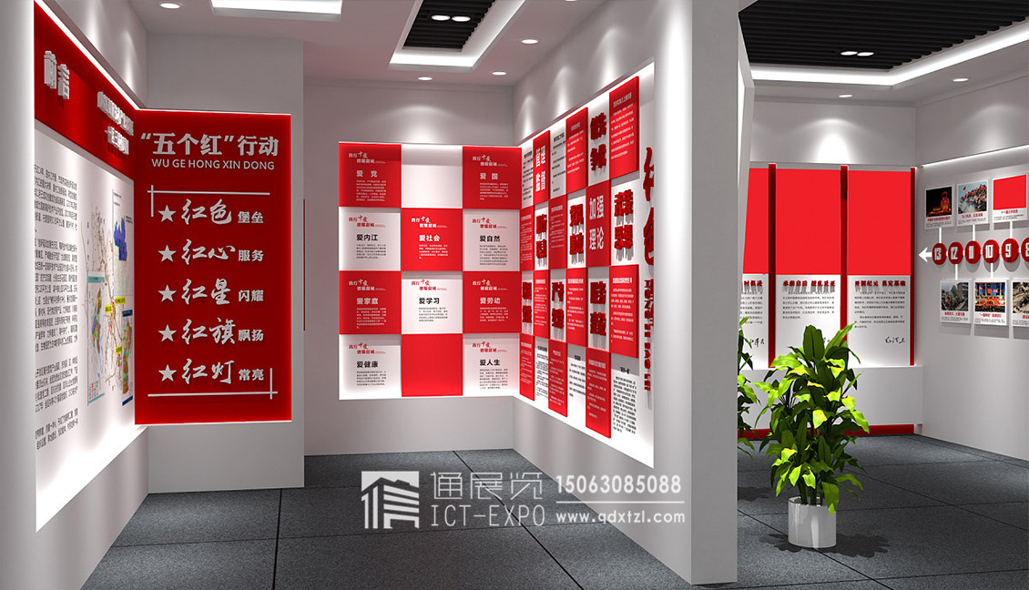 党建展馆的最大特点是其鲜明的主题,因为不可能像其他展馆一样展示产品和技术,只能展示有限的特定内容。党建陈列室的设计应从党的成立背景,党的初衷,党的成长,党的奋斗历史等历史上向人民展示党的建设文化的发展。在细节上,党馆展馆的整个空间都以红色,箔红色文化为主,在色彩上不易创新。在党建展览馆内,可以设置一个党建文化学习区,使游客无论是党员还是群众都可以学习和感受党建文化的力量。